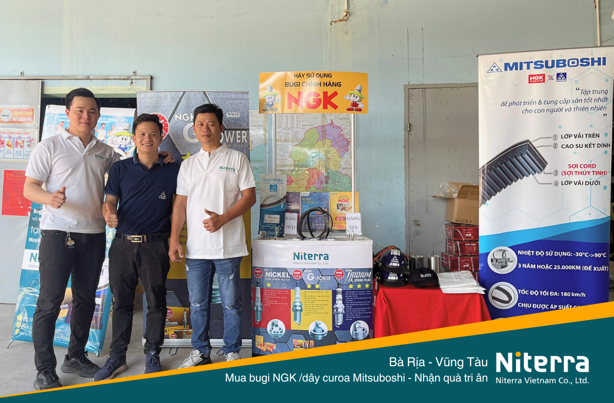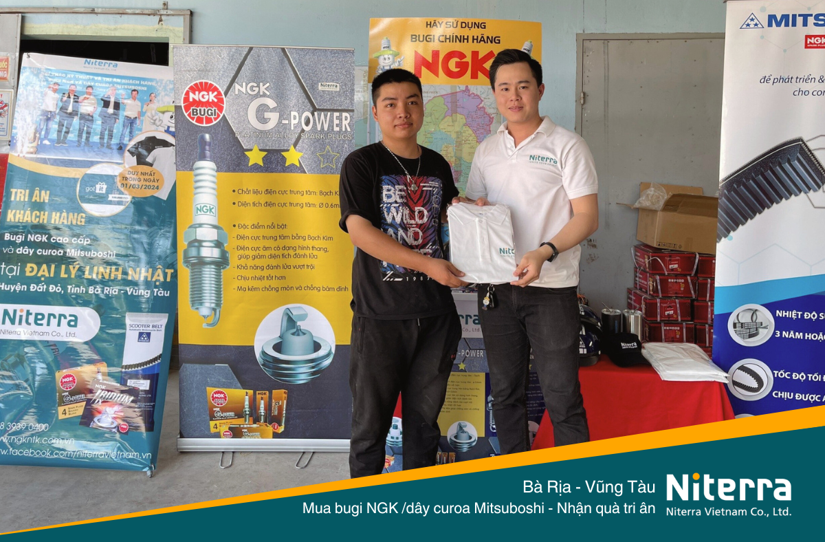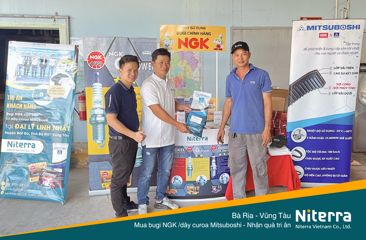 Để tiếp nối các sự kiện năm 2024, ngày 01/03/2024 vừa qua, Niterra tổ chức chương trình khuyến mãi tại Huyện Đất Đỏ, Bà Rịa – Vũng Tàu. Đồng hành cùng Niterra tại thành phố biển này là Đại lý chính hãng Linh Nhật và đây cũng là nơi diễn ra chương trình. Khách hàng mua bugi NGK và dây curoa Mitsuboshi trong ngày này sẽ được tặng kèm nhiều phần quà hấp dẫn.