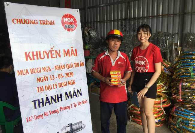 Với mục đích hỗ trợ đại lý tăng doanh số bán hàng, trong ngày 13/03/2020, Công ty Bugi NGK Việt Nam đã phối hợp cùng Đại lý Thành Mãn tỉnh Tây Ninh tổ chức một chương trình khuyến mãi đặc biệt. Khi mua bugi NGK, quý khách hàng được tham dự các vòng quay may mắn và nhận về cho mình những phần quà có giá trị đến từ Bugi NGK Việt Nam.