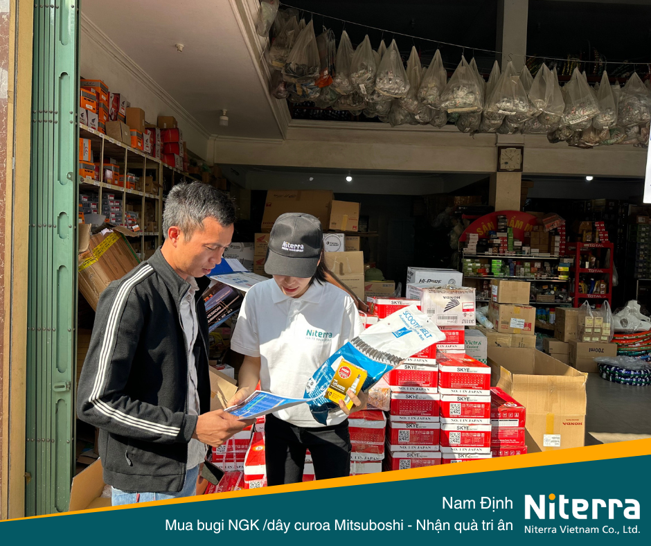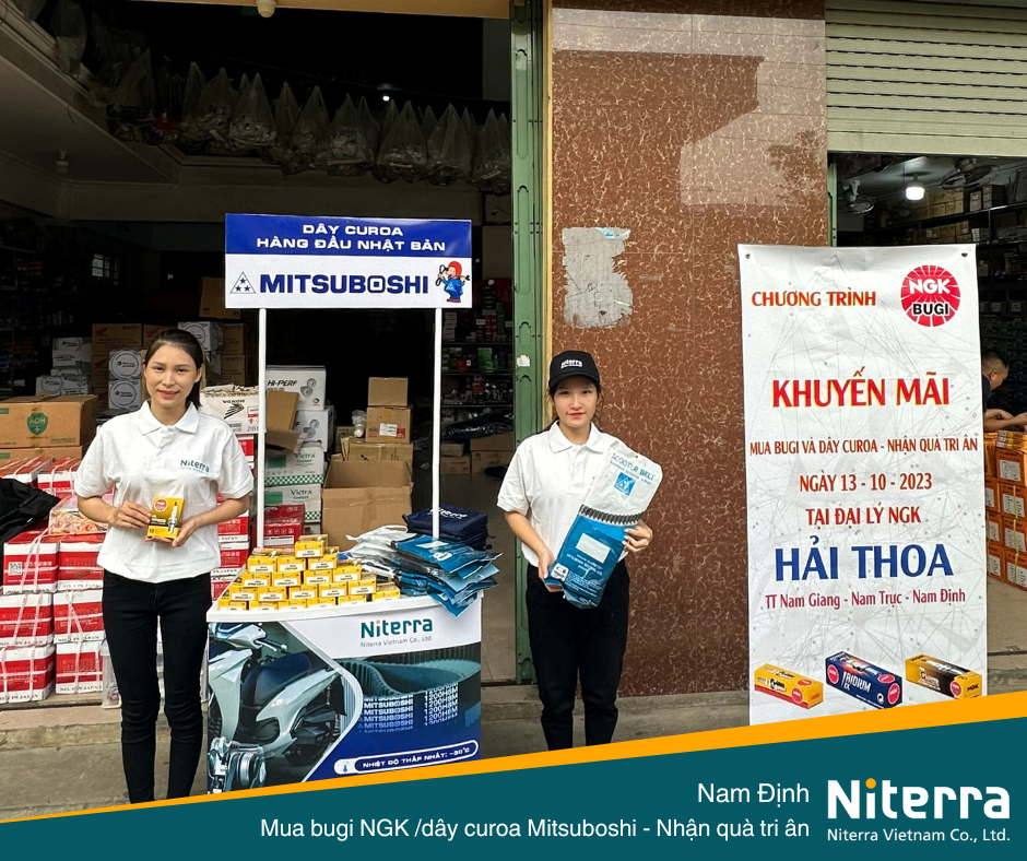 Vào ngày 13/10/2023, Niterra Việt Nam có dịp ghé thăm đại lý Hải Thoa (Thị trấn Nam Giang, huyện Nam Trực, tỉnh Nam Định) để hỗ trợ đại lý tổ chức chương trình khuyến mãi dành cho khách hàng mua bugi NGK hoặc dây curoa Mitsuboshi.