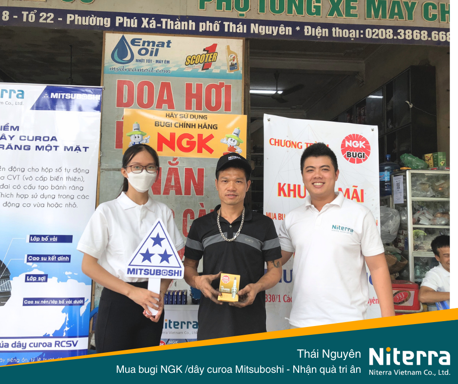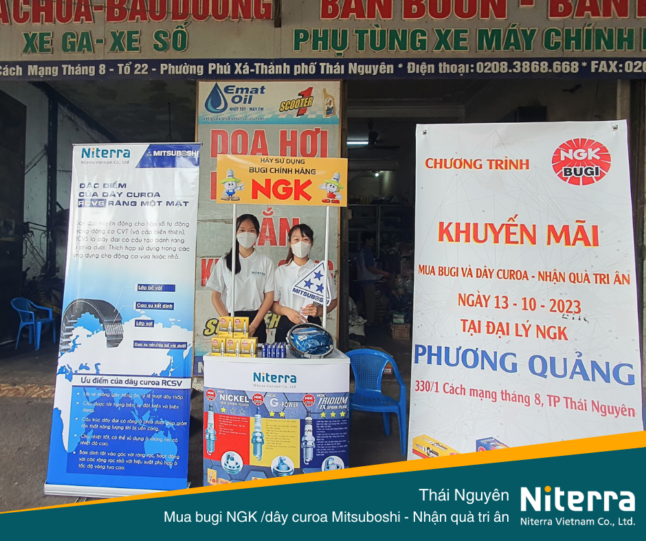 Vào ngày 13/10/2023, Niterra Việt Nam đã có mặt tại cửa hàng Phương Quảng, thành phố Thái Nguyên để tổ chức sự kiện khuyến mãi. Chương trình diễn ra duy nhất 01 ngày và nhận được sự quan tâm, ủng hộ của nhiều khách hàng.