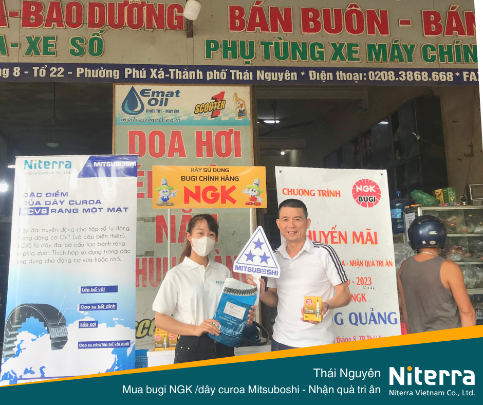 Tại nơi diễn ra chương trình (Cửa hàng Phương Quảng – 330/1 Cách Mạng Tháng 8, TP. Thái Nguyên), quý khách hàng có thể mua bugi NGK và dây curoa Mitsuboshi với giá cực kỳ ưu đãi và nhận được những món quà vô cùng thiết thực từ Niterra.