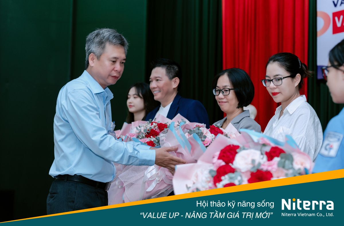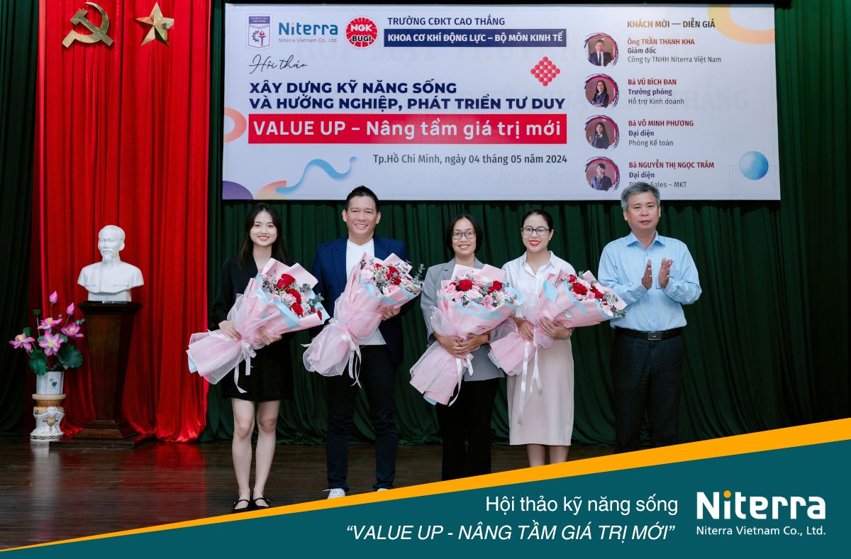 Trước khi chính thức bước vào các nội dung chính, đại diện Ban Giám hiệu Trường CĐKT Cao Thắng đã trao tặng hoa và quà lưu niệm cho các diễn giả, như một lời cảm ơn của Nhà trường đến Niterra Việt Nam trong công tác hỗ trợ sinh viên, góp phần đào tạo đầu ra chất lượng tốt, cung cấp nhân sự trí tuệ cao cho thị trường lao động.