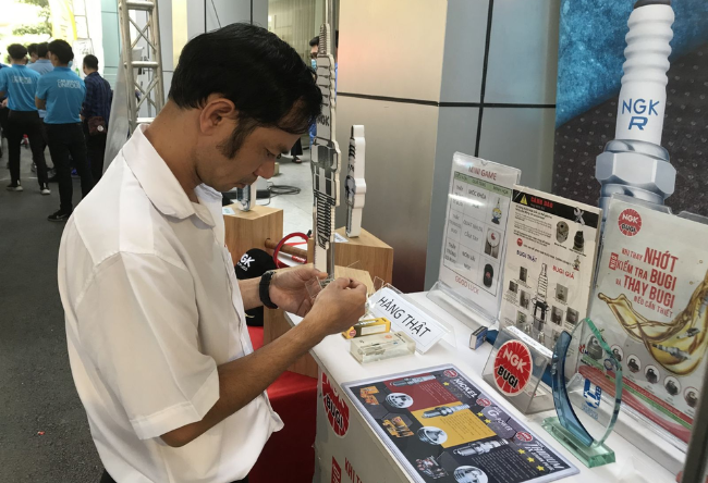 At the program, students also exhibited donor booths including NGK spark plugs. When you come to the booth, you will be able to "target" the products of NGK spark plugs, as well as the "real - fake" product model to help students gain more knowledge to know how to distinguish what a real - fake spark plug will be. In addition, NGK spark plugs also organize a small minigame to create more exciting atmosphere for the program accompanied by attractive gifts when students play to win prizes.