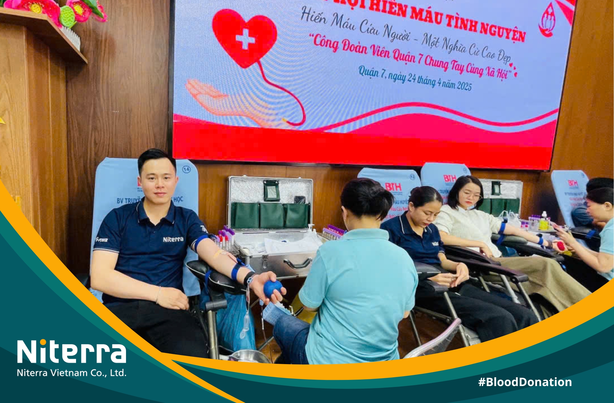 Mang tinh thần "Một giọt máu cho đi, một cuộc đời ở lại", sáng ngày 24/04/2025, tại Nhà Văn hóa Lao động Quận 7, các nhân viên Công ty TNHH Niterra Việt Nam đã có mặt để tham gia hiến máu tình nguyện. Chương trình do Liên đoàn Lao động Quận 7 phát động với 200 tình nguyện viên là cán bộ, công nhân viên chức, người lao động... đến từ các tổ chức, doanh nghiệp trong khu vực.