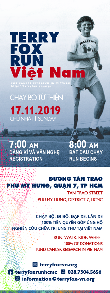 "Terry Fox For Run is a charity run named after Terry Fox – a bone cancer patient who persistently runs 42 kilometres a day from Canada East to West to raise funds for cancer research. Terry Fox completed 5,373 km (equivalent to the distance from Vietnam to Japan), but he had to stop the journey on the 144th day when cancer spread to his lungs and died at the age of 22, in 1981.