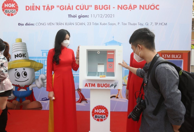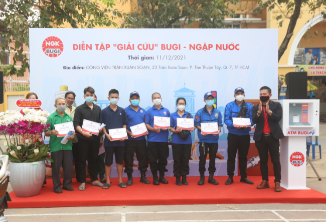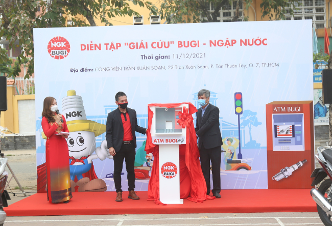 After a long time of studying the traffic situation in the rainy season in Vietnam, the Board of Directors of NGK Spark Plugs Company (Vietnam) has planned to implement a community project with practical meaning, to rescue people who have problems on flooded roads. The series of activities called "Rescue spark plugs" received the support of local authorities, the reception of many volunteer organizations and "street knights". It is highly educational and has an impact on students. The beginning of this series of activities is the event "Spark plug rescue drill" and the launch of the first spark plug ATM in Vietnam on 11th Dec, 2021.