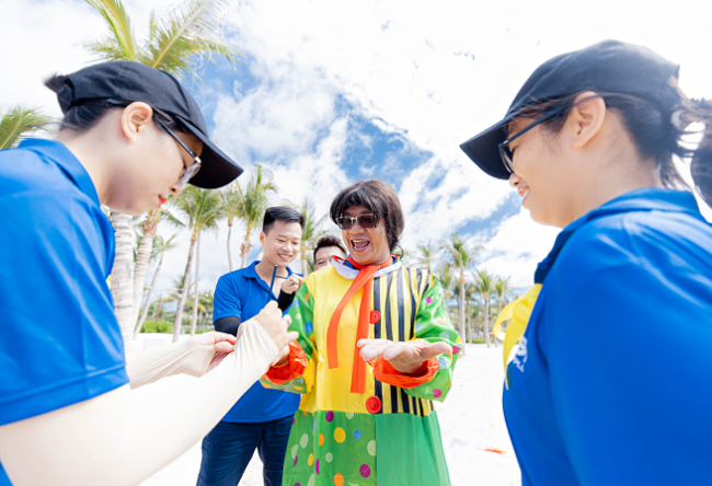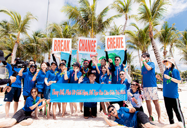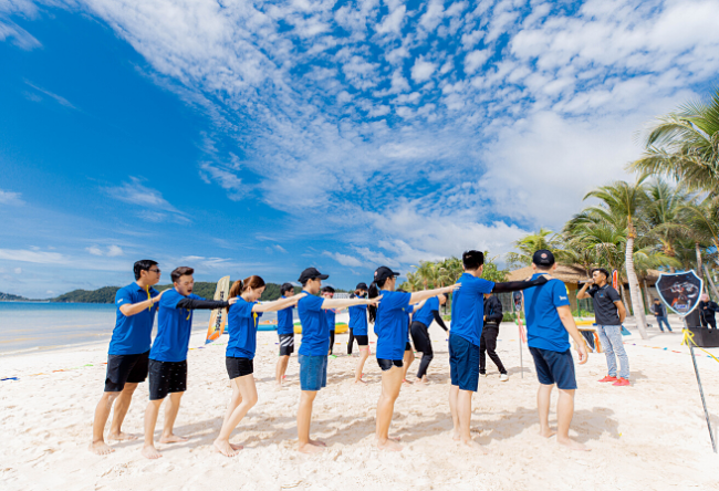 The teambuilding program takes place in the afternoon of 22/07/2022 on the beautiful beach of the group's resort. To increase awareness, all members of the delegation wear uniforms including hats, T-shirts, and prominent honeycomb sandals.