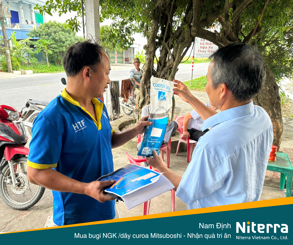 Vào ngày 13/10/2023, Niterra Việt Nam có dịp ghé thăm đại lý Hải Thoa (Thị trấn Nam Giang, huyện Nam Trực, tỉnh Nam Định) để hỗ trợ đại lý tổ chức chương trình khuyến mãi dành cho khách hàng mua bugi NGK hoặc dây curoa Mitsuboshi.