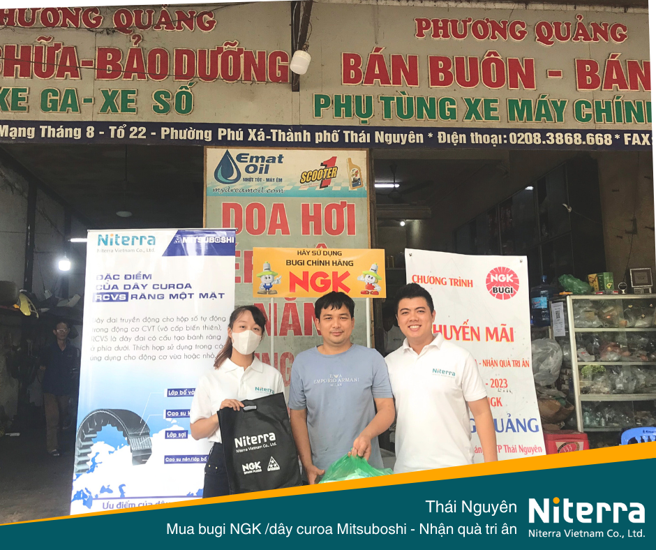 Tại nơi diễn ra chương trình (Cửa hàng Phương Quảng – 330/1 Cách Mạng Tháng 8, TP. Thái Nguyên), quý khách hàng có thể mua bugi NGK và dây curoa Mitsuboshi với giá cực kỳ ưu đãi và nhận được những món quà vô cùng thiết thực từ Niterra.